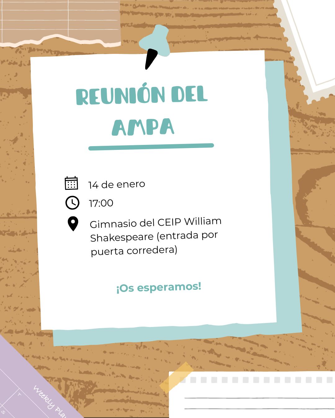 Por la presente, se convoca la Asamblea General Ordinaria de la AMPA William Shakespeare a celebrar de forma presencial en el gimnasio del colegio (ENTRADA POR LA PUERTA CORREDERA), el día MIERCOLES 22 de octubre de 2025, a las 17:15 horas en primera convocatoria, y en segunda convocatoria a las 17:30 horas con el siguiente Orden del día: